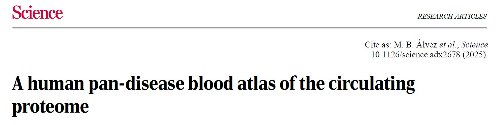 近日,延边大学理学院教师孟令奇以合作者身份参与了由瑞典生命科学实验室(SciLifeLab)牵头的“人类泛疾病血液蛋白图谱”研究,该成果在国际顶级学术期刊《Science》在线发表,题目为《A human pan-disease blood atlas of the circulating proteome》(覆盖多种疾病的循环血液蛋白组全景图谱)。