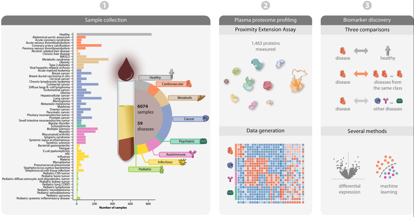 该研究论文由多国科研团队共同完成,论文通讯作者为瑞典皇家理工学院教授、Human Protein Atlas项目负责人Mathias Uhlén,第一作者为María Bueno Álvez。孟令奇参与了代谢性疾病相关蛋白标志物的分析与筛选工作,并在机器学习算法建模与数据解读方面提供了重要技术支持。研究团队基于8262名个体、9027份血液样本,利用高灵敏度近距扩增分析(Proximity Extension Assay, PEA)技术,对5416个蛋白靶点进行了系统性检测,覆盖了心血管、代谢、癌症、自身免疫、感染性及精神类等59种疾病。研究建立了一个可公开访问的“泛疾病血液资源库”(Disease Blood Resource, Human Protein Atlas),实现了不同疾病血液蛋白特征的统一比较,为探索疾病特异性与共通性生物标志物提供了系统资源。